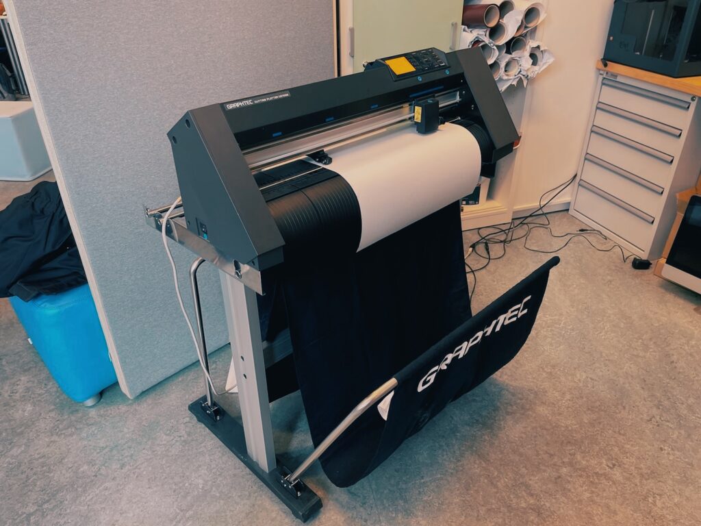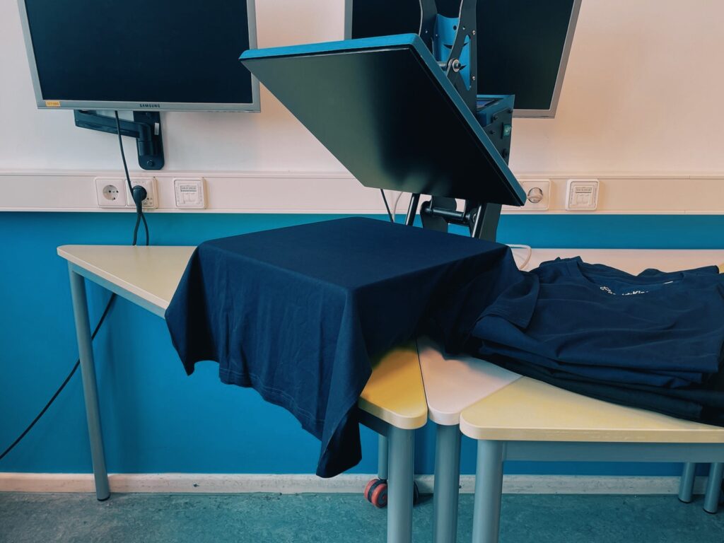 Der Druck auf unseren Produkten wird in der Schule und uns durchgeführt. Die benötigten Maschinen - ein Plotter für das Zuschneiden von der Folie und die Heizpresse für den eigentlichen Druck auf den Textilien - werden uns vom Informatikfachbereich zur Verfügung gestellt.